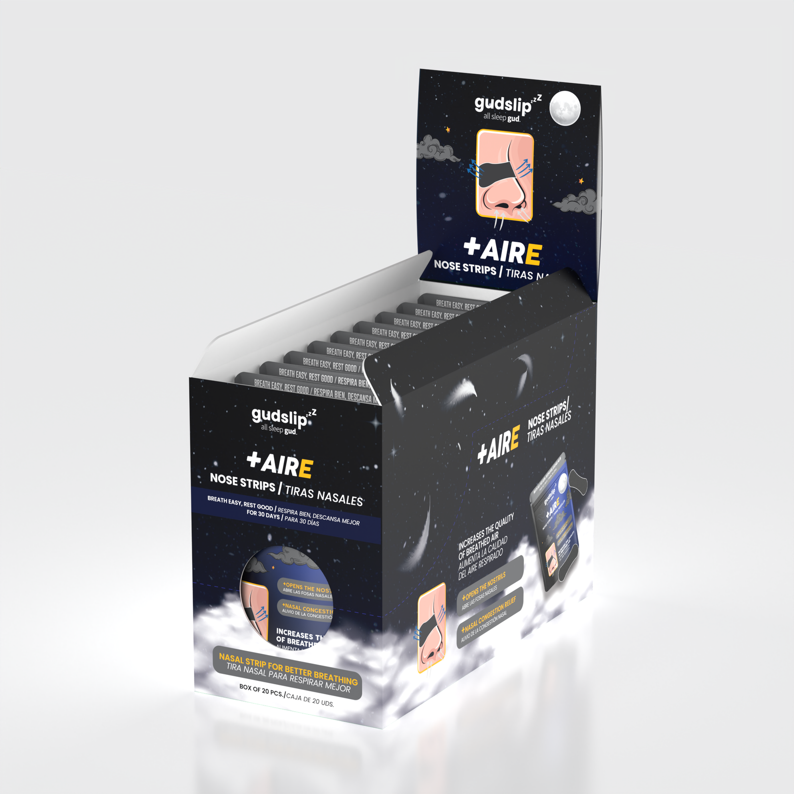 מדבקות האף של Gudslip משפרות את זרימת האוויר ומקלות על הנשימה בזמן השינה. פתרון נוח ופשוט לנשימה חופשית ושינה איכותית יותר.